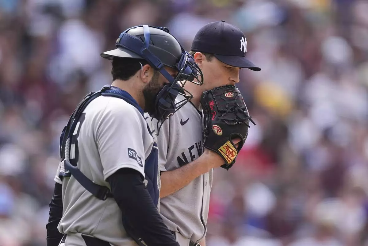 New York Yankees catcher Austin Wells, left, confers with starting pitcher Max Fried, right, after Fried gave up an RBI triple to Colorado Rockies' Michael Toglia in the fourth inning of a baseball game Saturday, May 24, 2025, in Denver. (AP Photo/David Zalubowski)