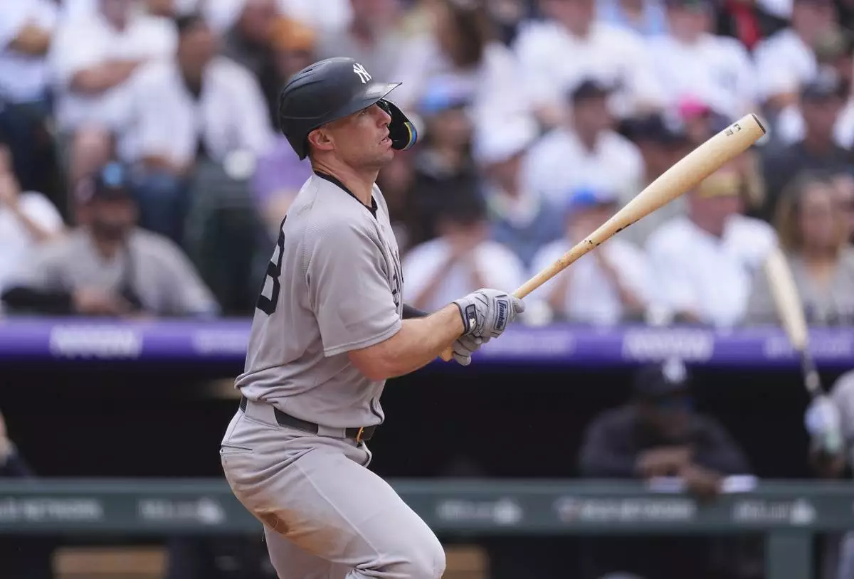 New York Yankees' Paul Goldschmidt singles against Colorado Rockies starting pitcher Kyle Freeland in the third inning of a baseball game Saturday, May 24, 2025, in Denver. (AP Photo/David Zalubowski)