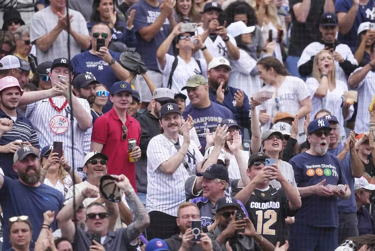 Fans applaud as New York Yankees' Aaron Judge circles the bases after hitting a solo home run off Colorado Rockies starting pitcher Kyle Freeland in the first inning of a baseball game Saturday, May 24, 2025, in Denver. (AP Photo/David Zalubowski)