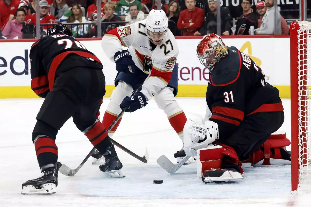 Florida Panthers' Eetu Luostarinen (27) looses control of the puck skating between Carolina Hurricanes' Sean Walker (26) and goaltender Frederik Andersen (31) during the first period of Game 2 of the NHL hockey Stanley Cup Eastern Conference finals in Raleigh, N.C., Thursday, May 22, 2025. (AP Photo/Karl DeBlaker)