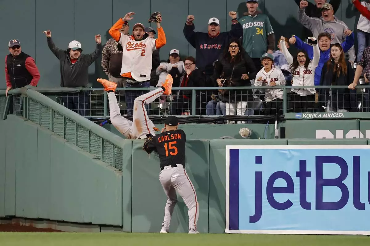 Baltimore Orioles outfielder Jorge Mateo falls into the bullpen unable to make the catch as Dylan Carlson (15) looks on a home run by Boston Red Sox's Abraham Toro during the ninth inning of the second baseball game of a doubleheader, Saturday, May 24, 2025, at Fenway Park in Boston. (AP Photo/Mary Schwalm)