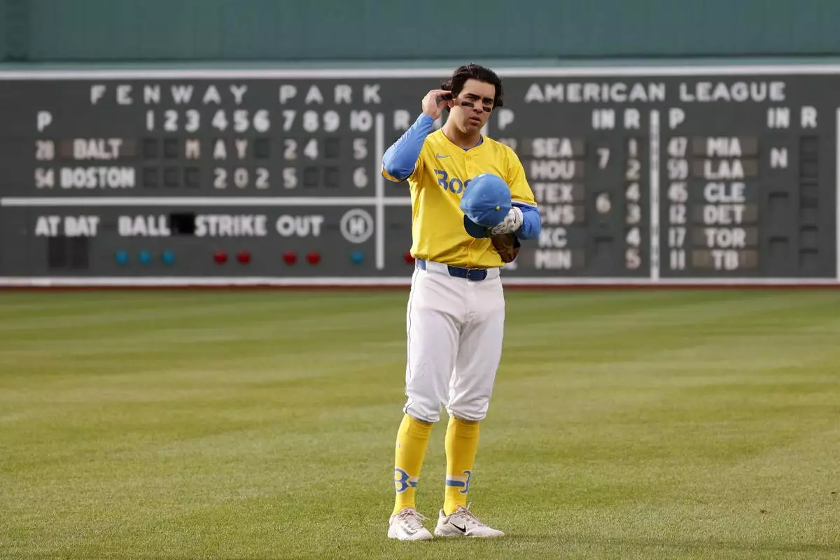 Boston Red Sox third baseman Marcelo Mayer stands in the field before the second baseball game of a doubleheader against the Baltimore Orioles, Saturday, May 24, 2025, at Fenway Park in Boston. (AP Photo/Mary Schwalm)