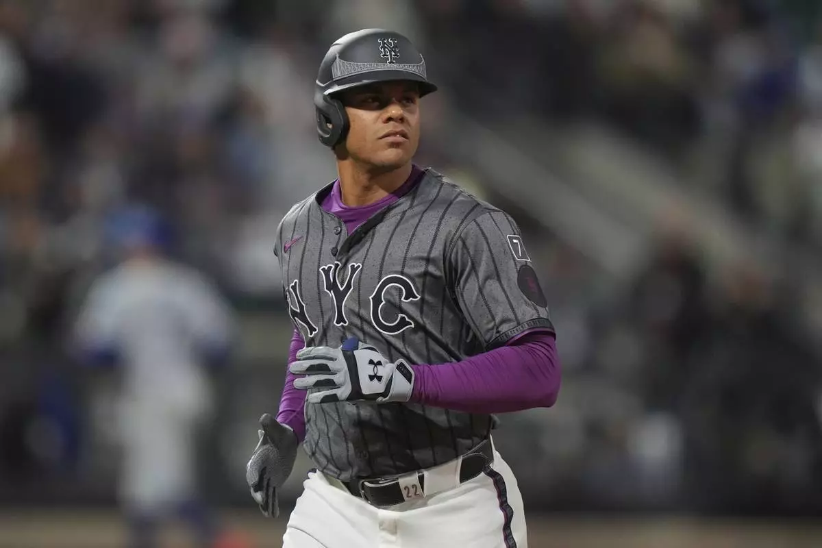 New York Mets' Juan Soto reacts after the fourth inning of a baseball game against the Los Angeles Dodgers Saturday, May 24, 2025, in New York. (AP Photo/Frank Franklin II)