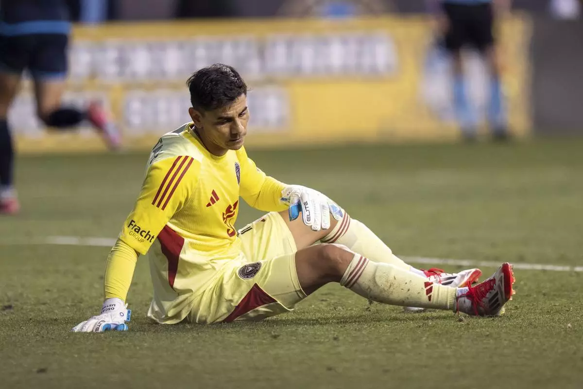 Inter Miami's Oscar Ustari reacts after giving up a second goal during the first half of an MLS soccer match against the Philadelphia Union, Saturday, May 24, 2025, in Chester, Pa.. (AP Photo/Chris Szagola)