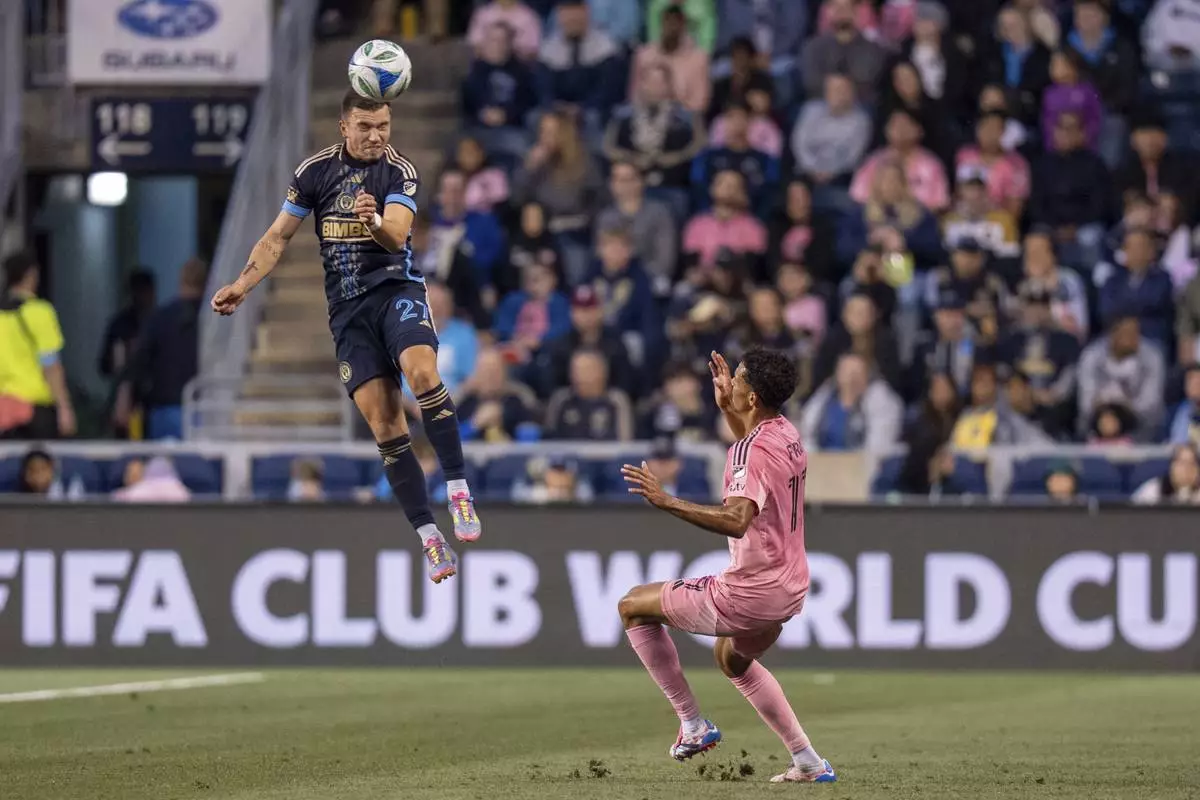 Philadelphia Union's Kai Wagner, left, leaps to head the ball over Inter Miami's Ian Fray, right, during the first half of an MLS soccer match, Saturday, May 24, 2025, in Chester, Pa.. (AP Photo/Chris Szagola)