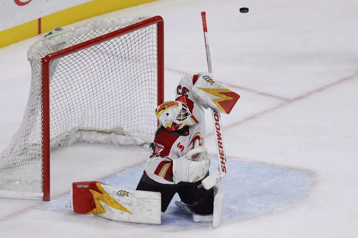 Ottawa Charge goaltender Gwyneth Philips makes a save against the Minnesota Frost during the first overtime period of Game 3 of the PWHL hockey finals Saturday, May 24, 2025, in St. Paul, Minn. (AP Photo/Bailey Hillesheim)