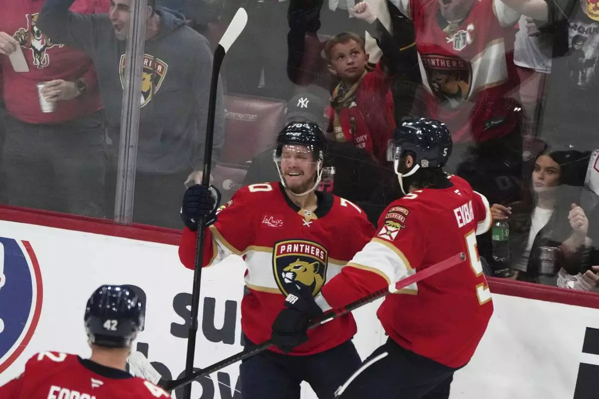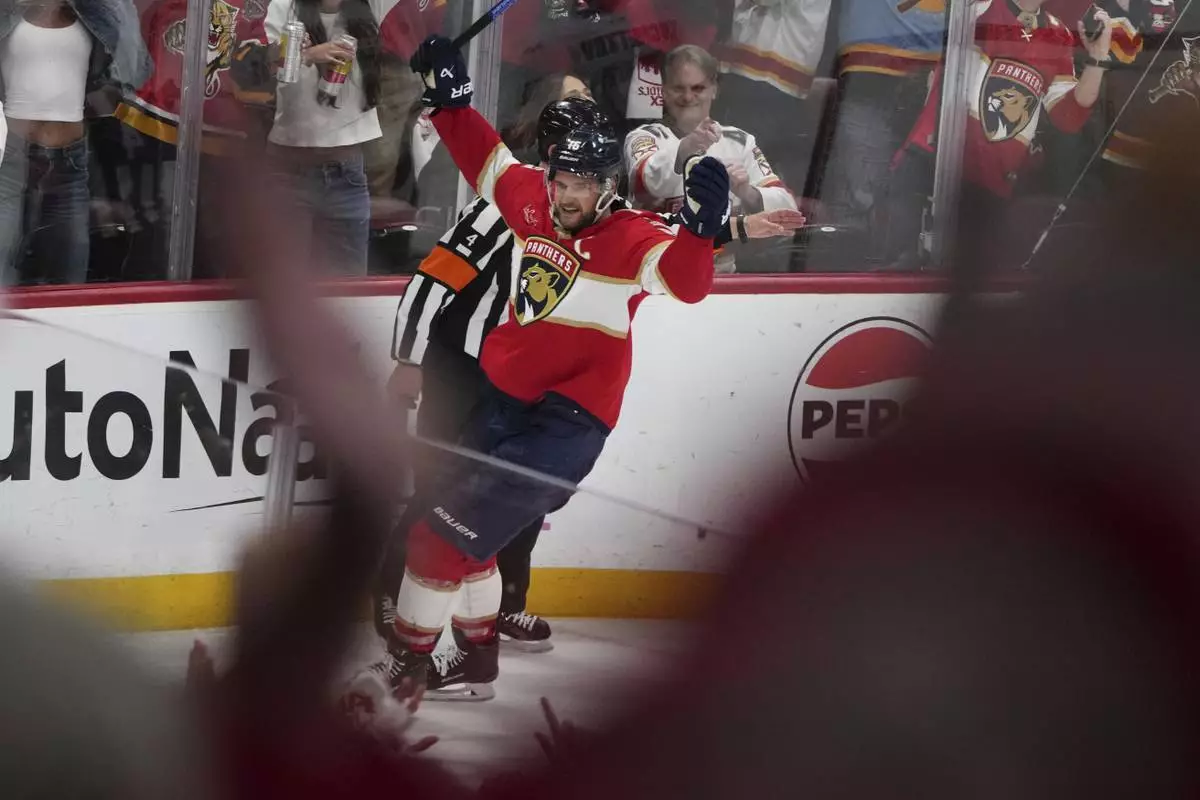 SUNRISE, Fla. (AP) — It was tied 1-1 going into the third period. It turned into a blowout. And after a five-goal barrage, one like none other in Florida playoff history, the Panthers are one win from their third consecutive trip to the Stanley Cup Final.