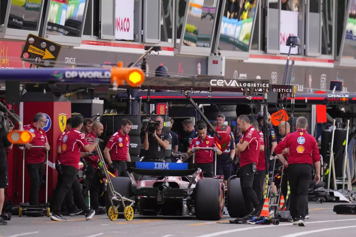 Ferrari driver Charles Leclerc of Monaco gets a pit service during the qualifying session ahead of the Formula One Monaco Grand Prix race at the Monaco racetrack in Monaco, Saturday, May 24, 2025. (AP Photo/Manu Fernandez)
