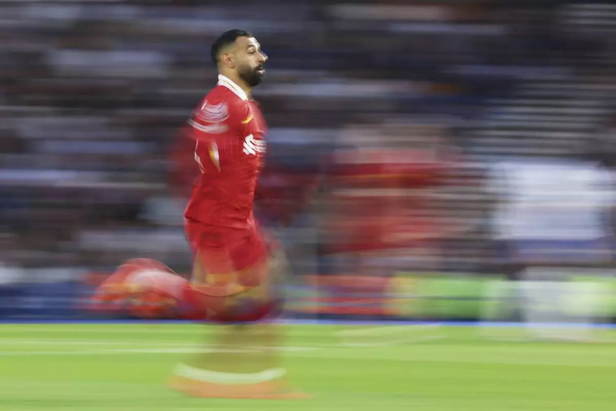 Liverpool's Mohamed Salah in action during the English Premier League soccer match between Brighton and Liverpool at American Express Stadium in Brighton, England, Monday, May 19, 2025. (AP Photo/Ian Walton)