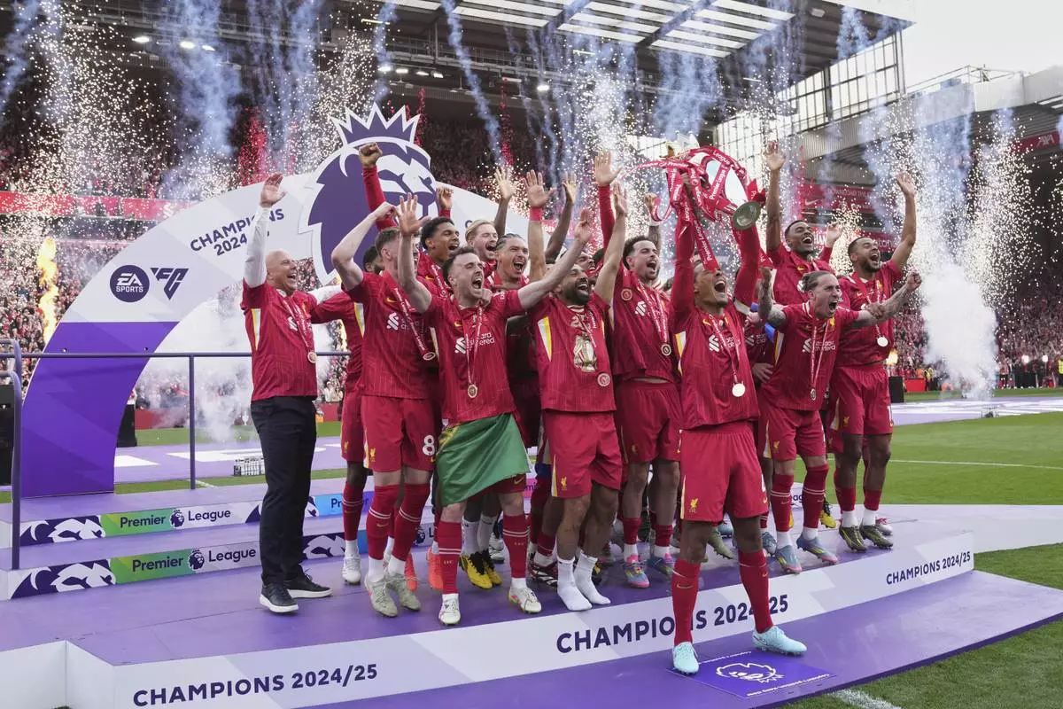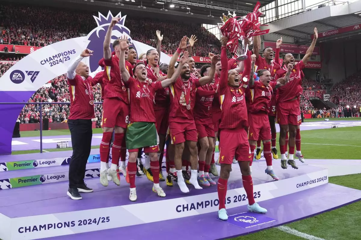 Liverpool players celebrate with the winner's trophy after the English Premier League soccer match between Liverpool and Crystal Palace at the Anfield stadium in Liverpool, England, Sunday, May 25, 2025. (AP Photo/Jon Super)