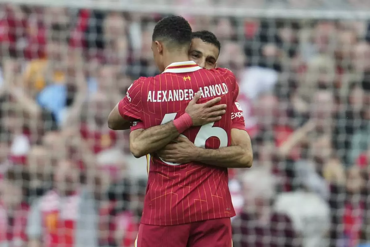 Liverpool's Mohamed Salah hugs teammate Trent Alexander-Arnold to celebrate after scoring his side's first goal during the English Premier League soccer match between Liverpool and Crystal Palace at the Anfield stadium in Liverpool, England, Sunday, May 25, 2025. (AP Photo/Jon Super)