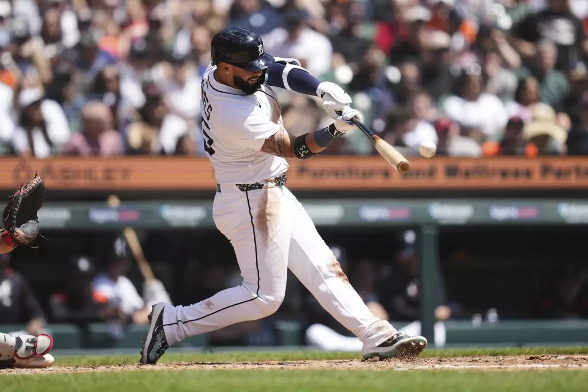 Detroit Tigers' Gleyber Torres hits a one-run double against the Cleveland Guardians in the fourth inning during a baseball game, Sunday, May 25, 2025, in Detroit. (AP Photo/Paul Sancya)