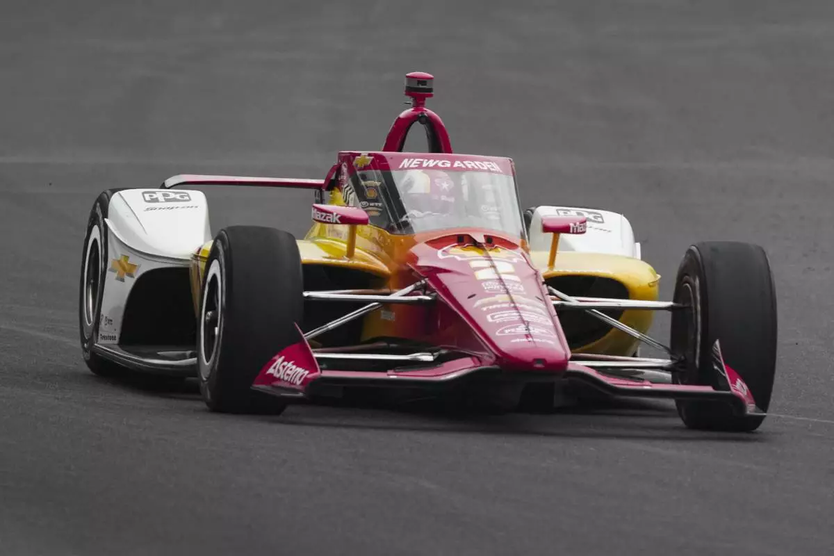 Josef Newgarden heads into the first turn during of the Indianapolis 500 auto race at Indianapolis Motor Speedway in Indianapolis, Sunday, May 25, 2025. (AP Photo/AJ Mast)