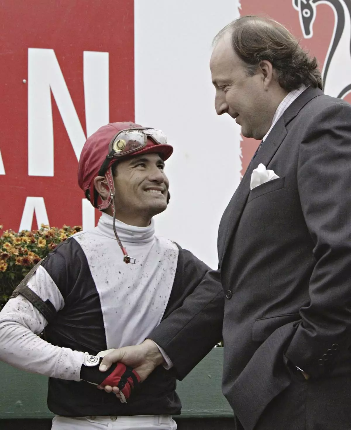 FILE - Jockey Corey Nakatani, left, shakes hands with trainer Christophe Clement after winning the Canadian International aboard Relaxed Gesture from Ireland at Woodbine Racetrack in Toronto, Sunday Oct. 23, 2005. (Frank Gunn/The Canadian Press via AP, File)