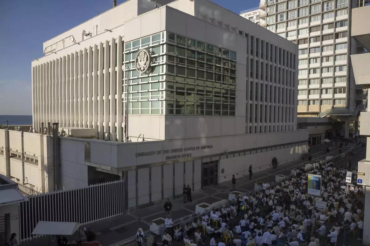 FILE - Activists sit in front of the U.S. Embassy branch office in Tel Aviv, Israel, during a protest, Wednesday, Jan. 8, 2025. (AP Photo/Ohad Zwigenberg, File)