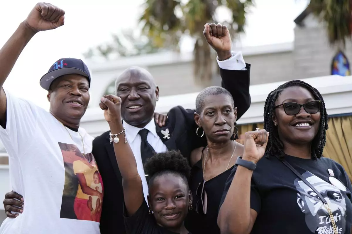 Attorney Ben Crump, second from left, raises his fist with George Floyd's sisters, LeTonya Floyd, left, and Zsa Zsa Floyd, second from left, along with great niece Arianna Williams, 7, and niece Bianca Williams, right, before a memorial service on the anniversary of Floyd's death on Sunday, May 25, 2025, in Houston. (AP Photo/Ashley Landis)