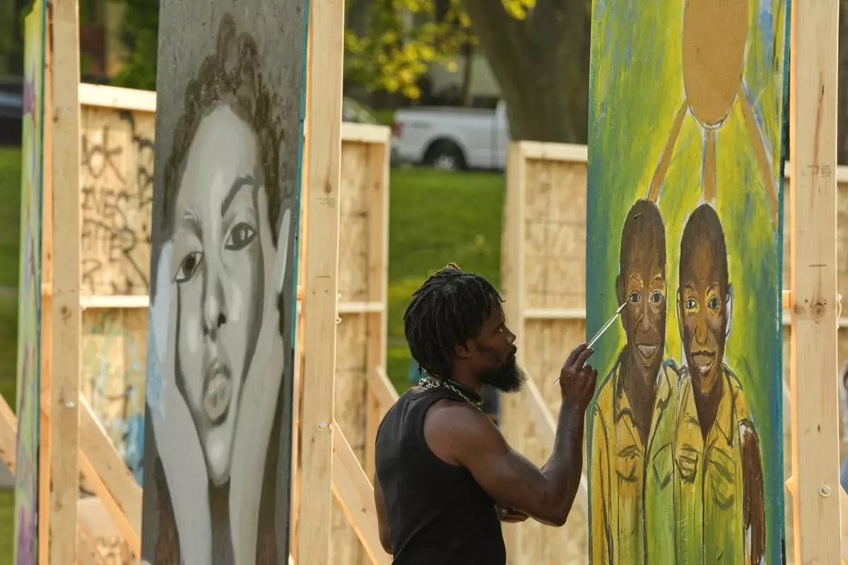 Flahn Manly works on a painting in a park near George Floyd Square on the five-year anniversary of Floyd's death, Sunday, May 25, 2025, in Minneapolis. (AP Photo/Abbie Parr)