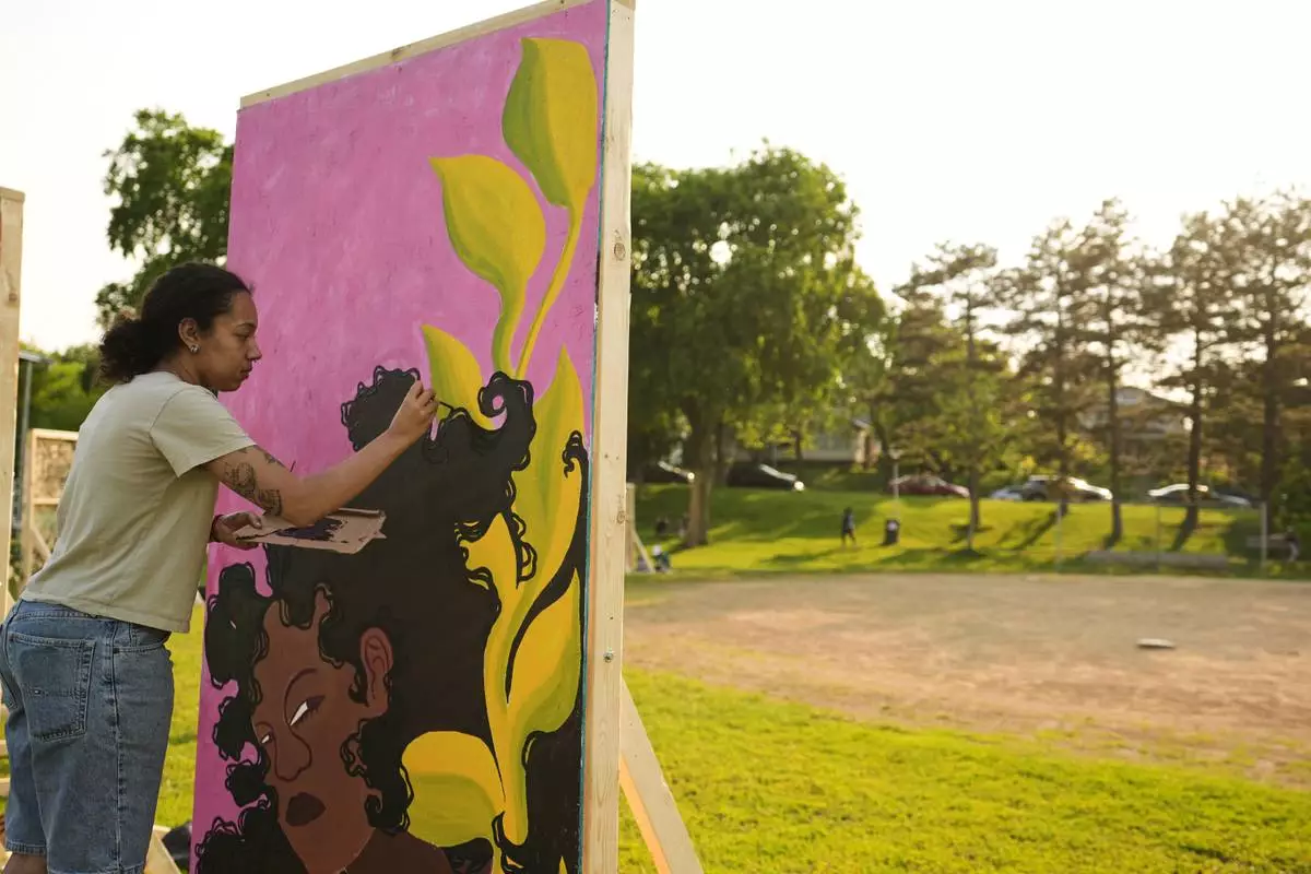 Eva Ngono works on a painting in a park near George Floyd Square on the five-year anniversary of Floyd's death, Sunday, May 25, 2025, in Minneapolis. (AP Photo/Abbie Parr)