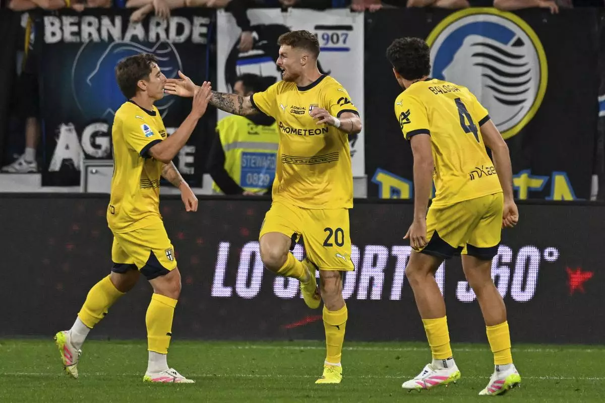 Parma's Antoine Hainaut celebrates after scoring a goal for his team during the Serie A soccer match between Atalanta and Parma at the Gewiss Stadium in Bergamo, Italy, Sunday, May 25, 2025. (Tano Pecoraro/LaPresse via AP)