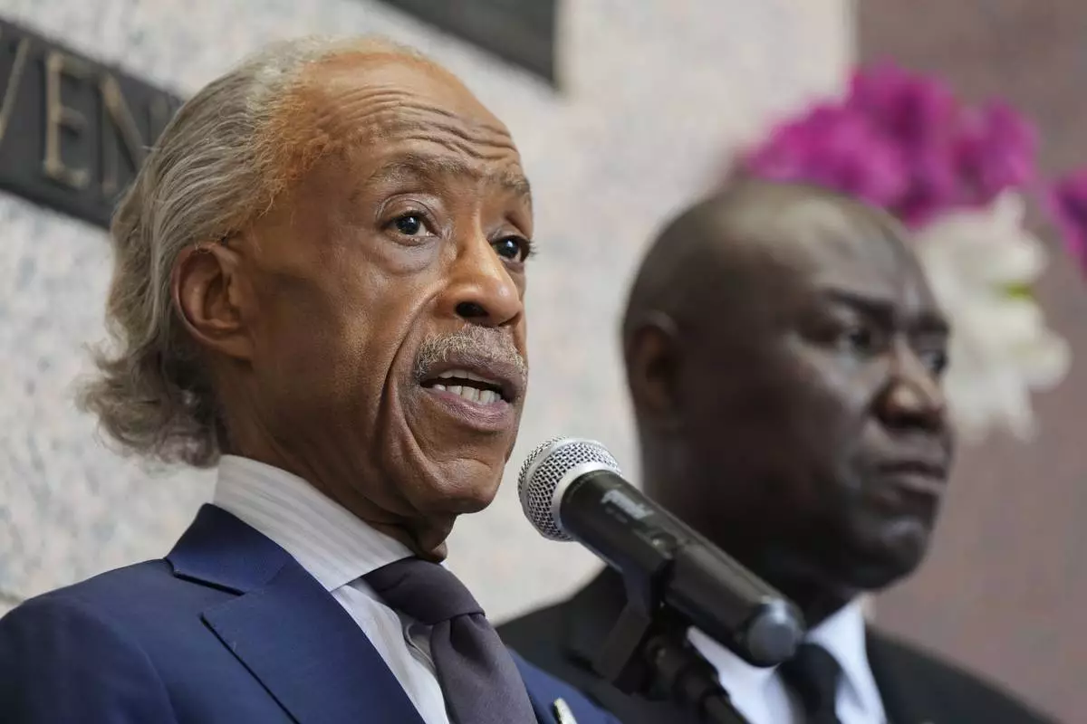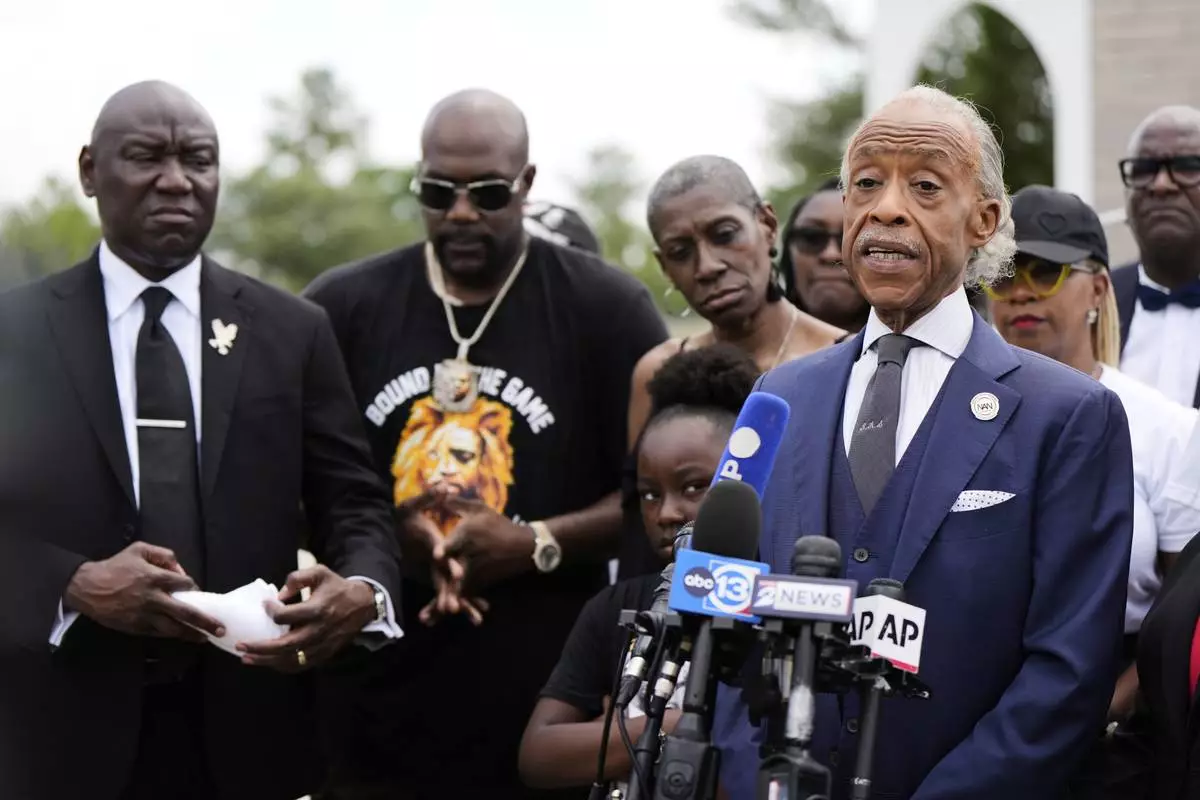 Rev. Al Sharpton, right, speaks at a press conference surrounded by George Floyd's family and public officials after a memorial service on the anniversary of Floyd's death on Sunday, May 25, 2025, in Houston. (AP Photo/Ashley Landis)