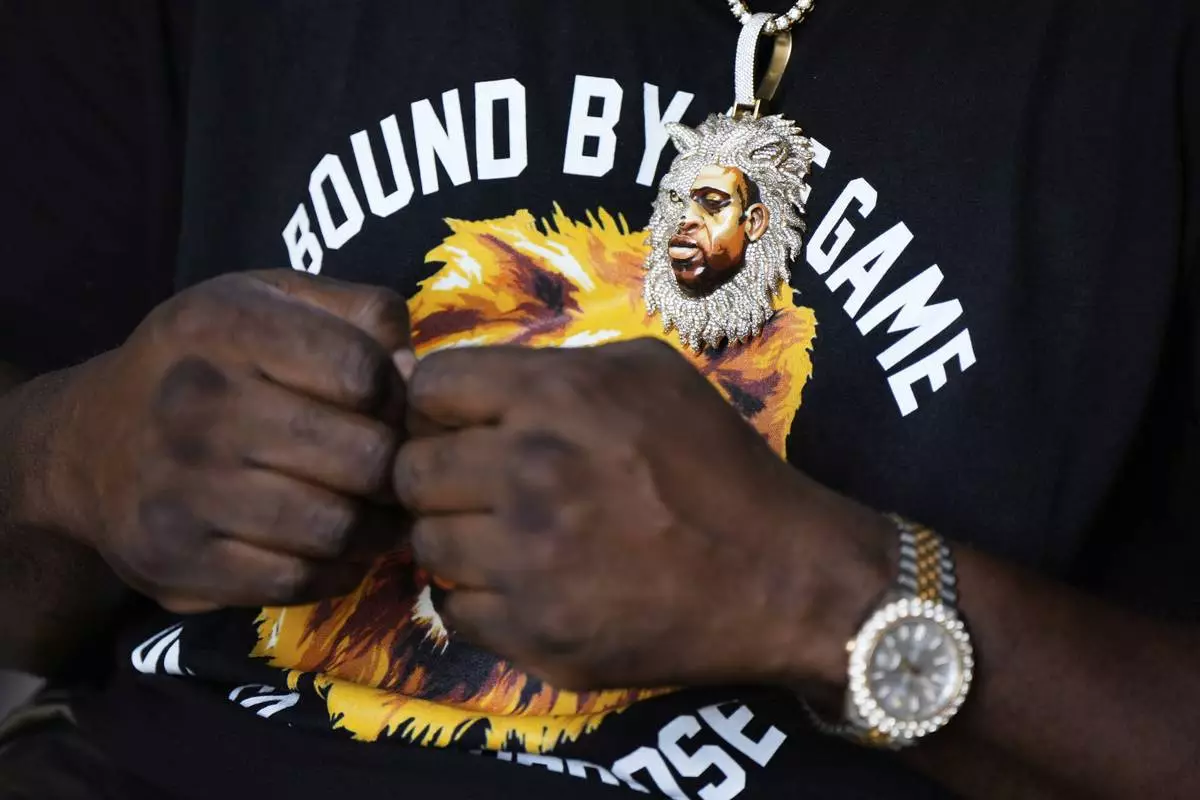 George Floyd's brother, Philonise Floyd, wears a pendent of his brother's face with a lion during a memorial service on the anniversary of Floyd's death on Sunday, May 25, 2025, in Houston. (AP Photo/Ashley Landis)