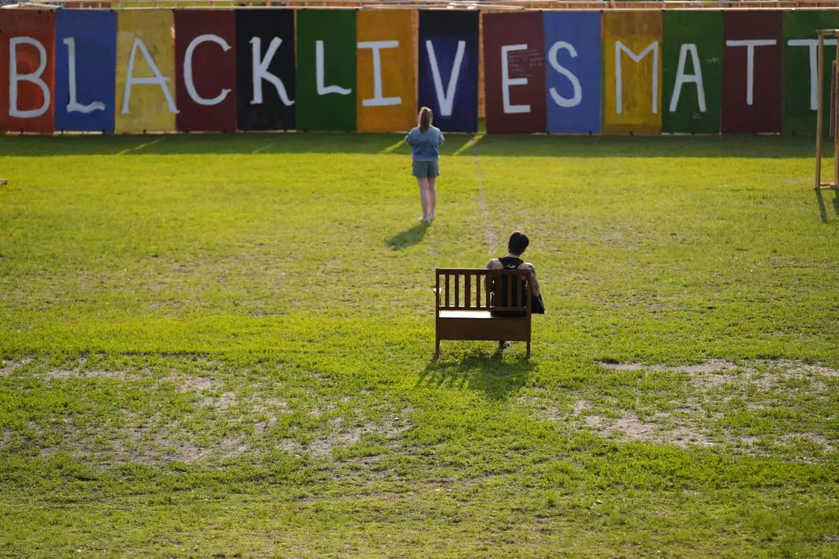 People visit a Black Lives Matter painting in a park near George Floyd Square on the five-year anniversary of Floyd's death, Sunday, May 25, 2025, in Minneapolis. (AP Photo/Abbie Parr)