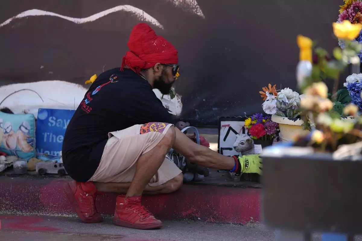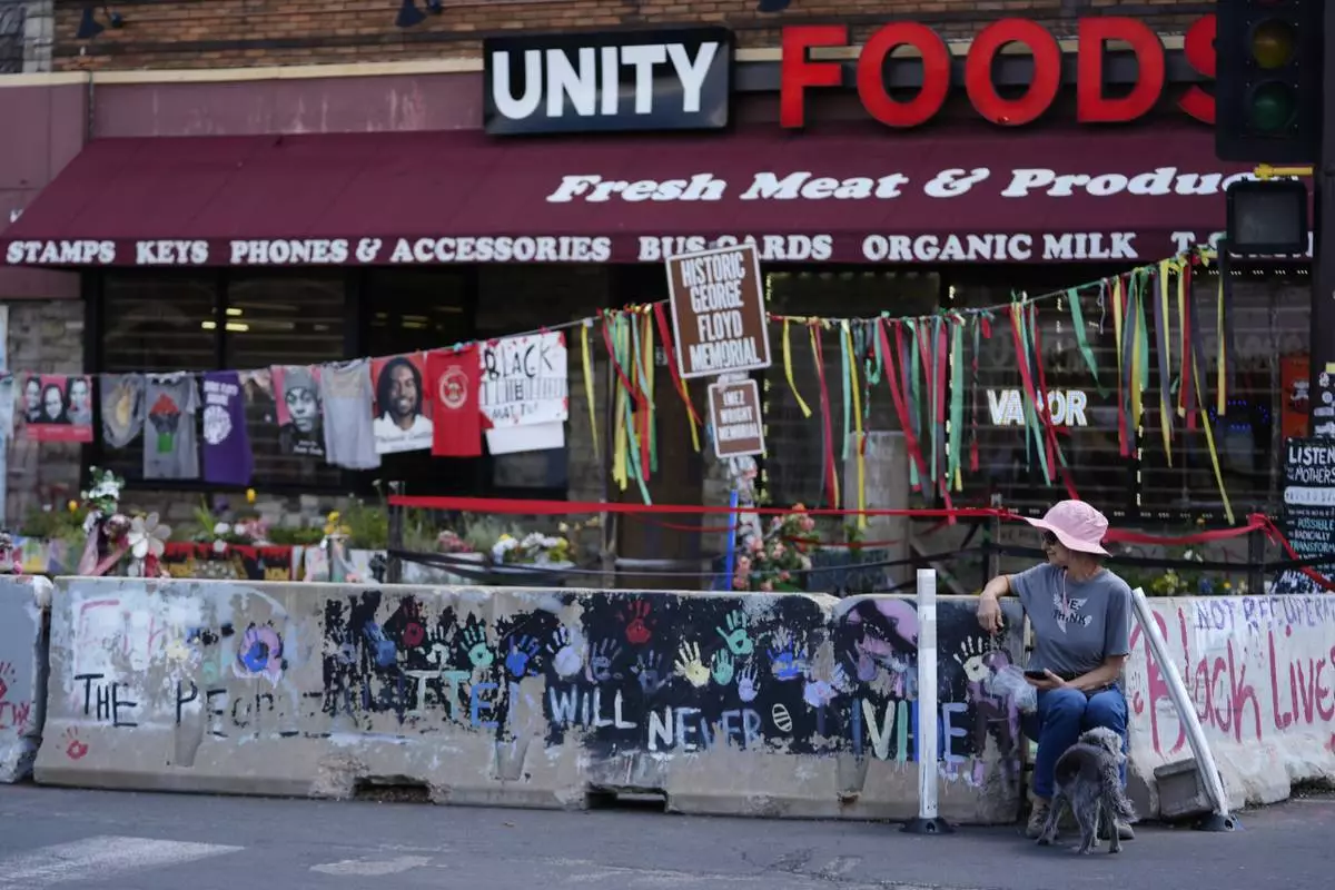 A person visits the spot of George Floyd's murder at George Floyd Square on the five-year anniversary of Floyd's death, Sunday, May 25, 2025, in Minneapolis. (AP Photo/Abbie Parr)