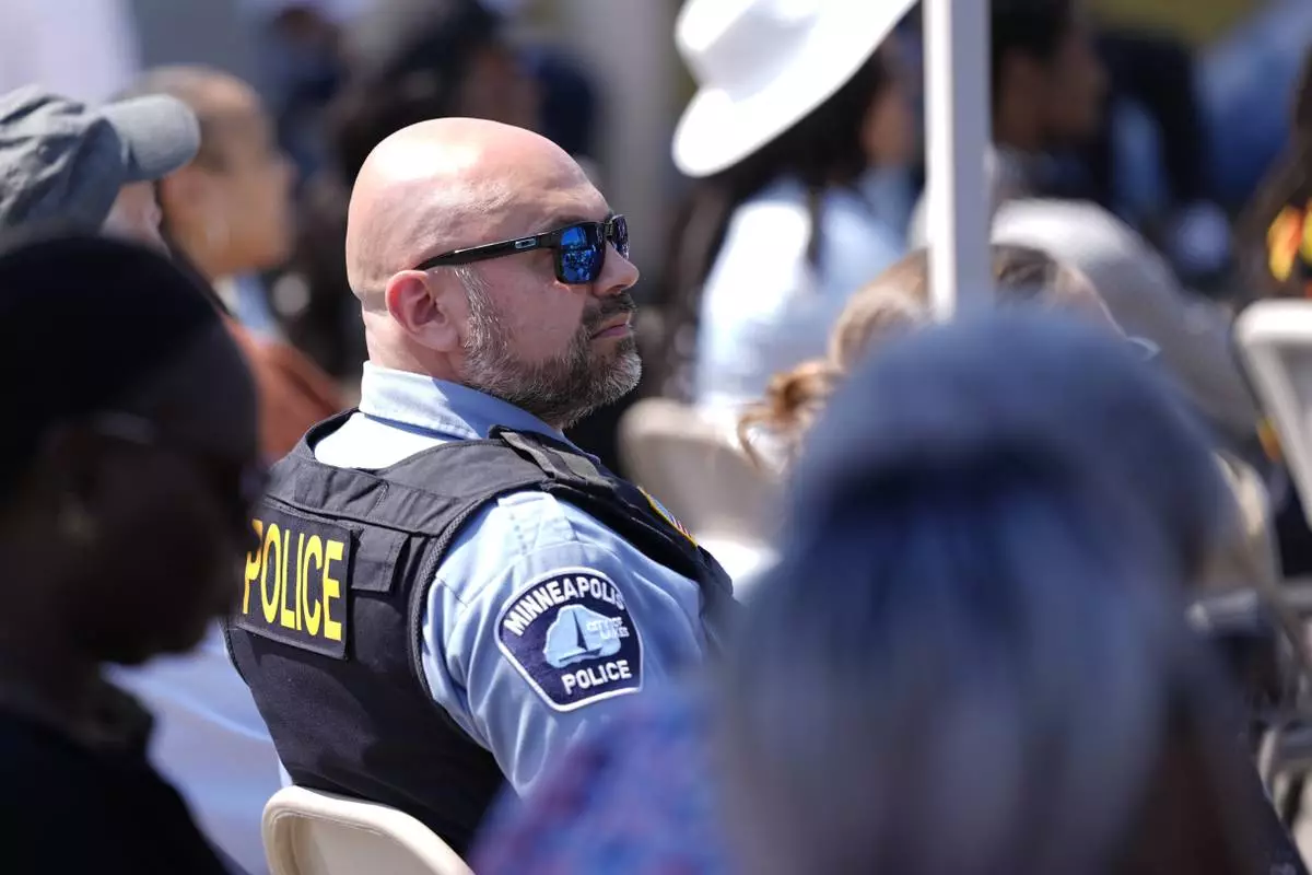 A Police officer attends a prayer service at George Floyd Square on the five-year anniversary of Floyd's death, Sunday, May 25, 2025, in Minneapolis. (AP Photo/Abbie Parr)