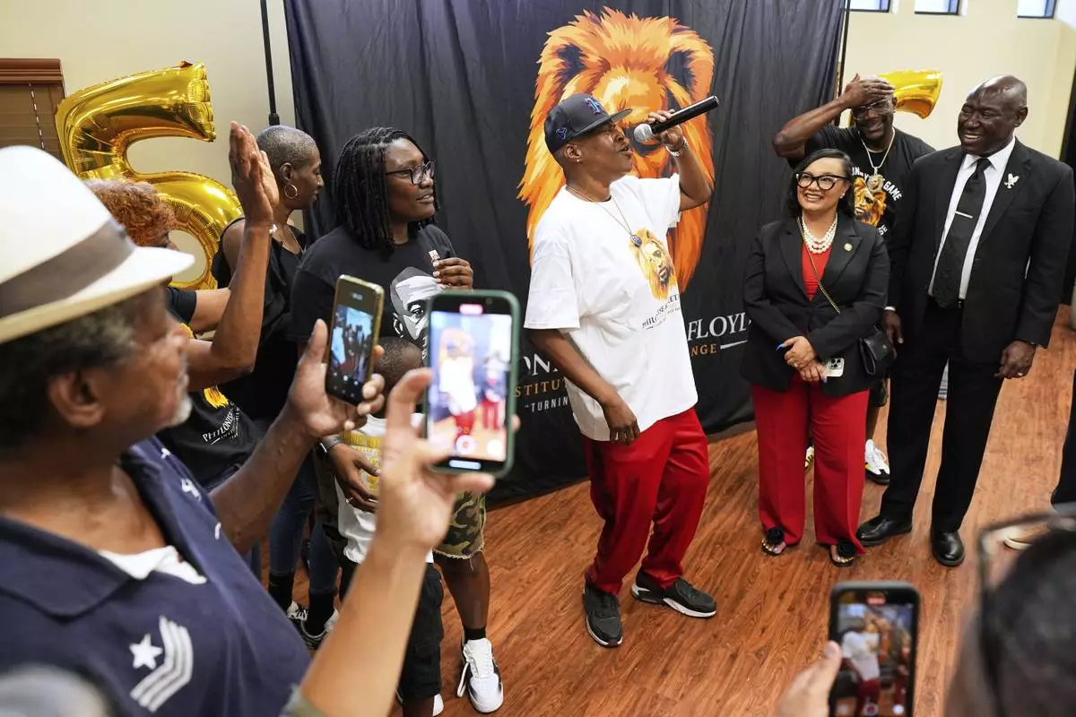George Floyd's sister, LeTonya Floyd, center, sings during a family celebration at Floyd's childhood housing project on the anniversary of Floyd's death on Sunday, May 25, 2025, in Houston. (AP Photo/Ashley Landis)