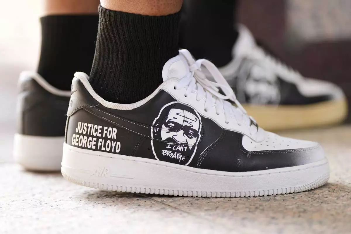 George Floyd's niece, Bianca Williams wears shoes with her uncle's face during a memorial service on the anniversary of Floyd's death on Sunday, May 25, 2025, in Houston. (AP Photo/Ashley Landis)