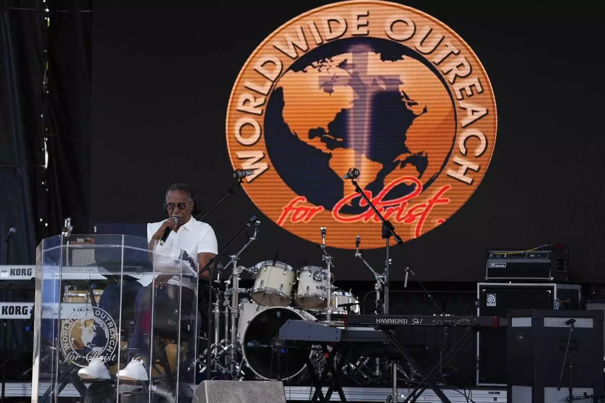 Pastor Curtis Farrar leads a prayer service at George Floyd Square on the five-year anniversary of Floyd's death, Sunday, May 25, 2025, in Minneapolis. (AP Photo/Abbie Parr)