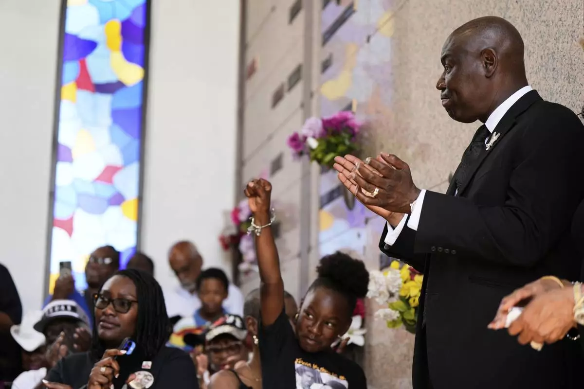 Attorney Ben Crump, right, applauds during a memorial service on the anniversary of George Floyd's death on Sunday, May 25, 2025, in Houston. (AP Photo/Ashley Landis)