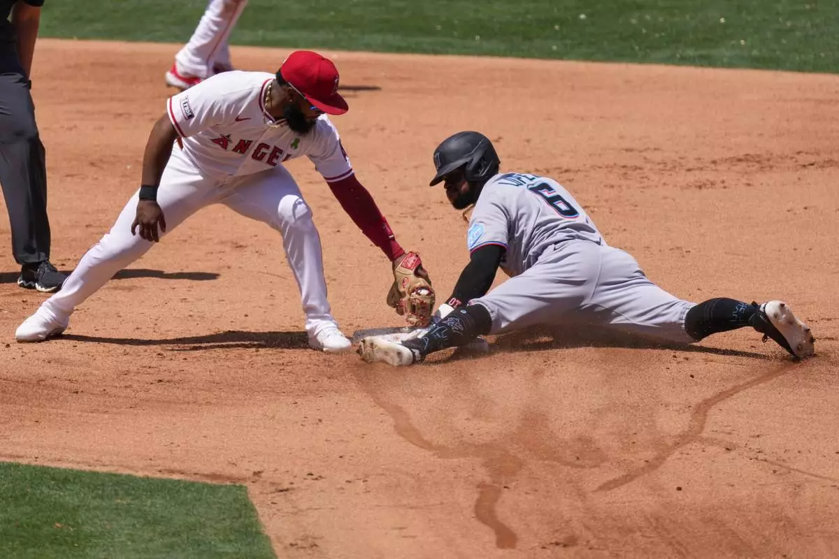 Miami Marlins' Otto Lopez, right, steals second as Los Angeles Angels second baseman Luis Rengifo puts a late tag on him during the fourth inning of a baseball game Sunday, May 25, 2025, in Anaheim, Calif. (AP Photo/Mark J. Terrill)
