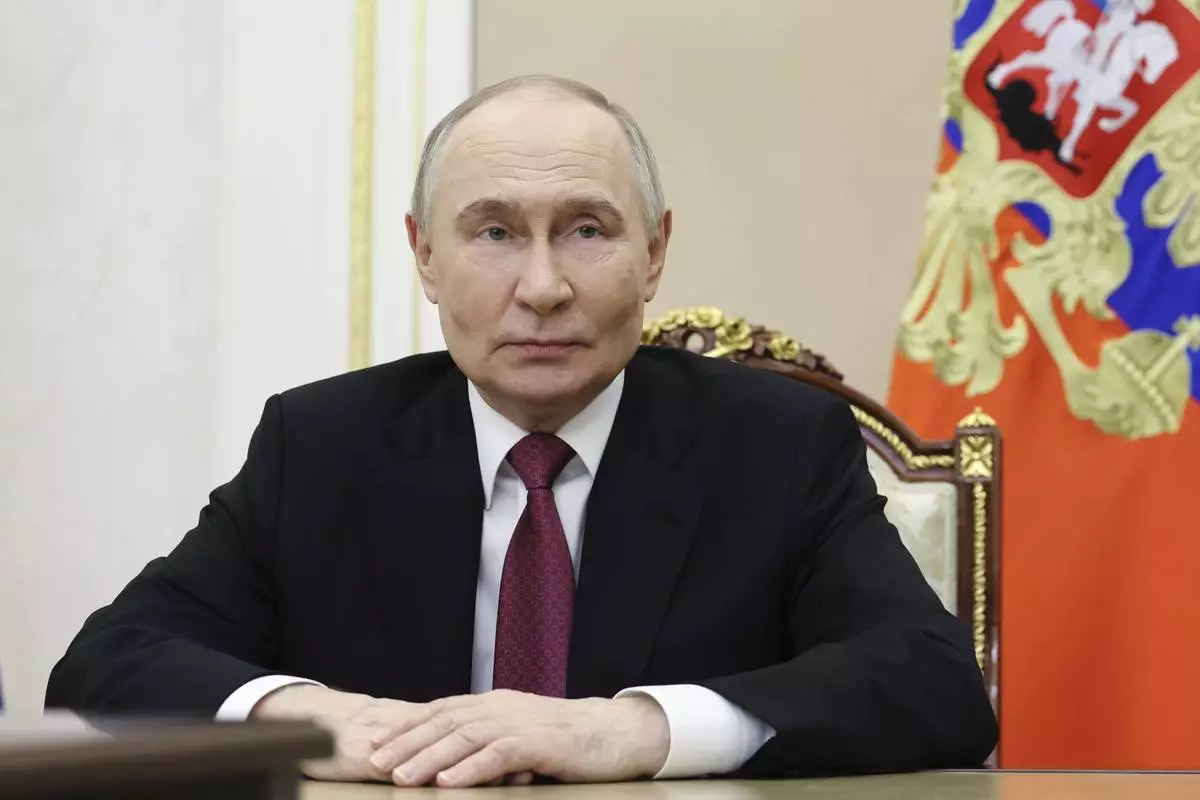 Russian President Vladimir Putin delivers a congratulatory message on the occasion of the 100th anniversary of the publication of the first issue of Komsomolskaya Pravda newspaper, in Moscow, Russia, Saturday, May 24, 2025. (Alexander Kazakov, Sputnik, Kremlin Pool Photo via AP)