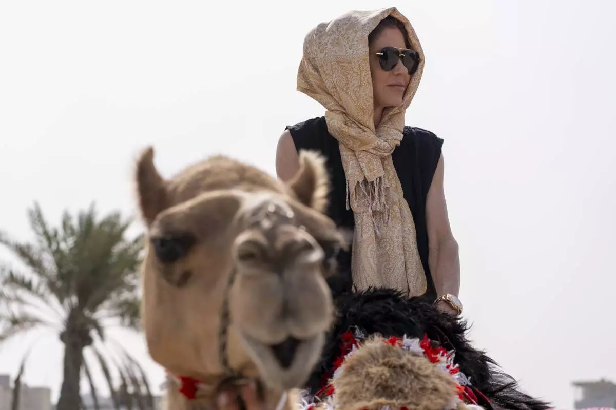 Homeland Security Secretary Kristi Noem rides a camel to a tour of Qal'at al-Bahrain Fort, Sunday, May 25, 2025, near Manama, Bahrain. (AP Photo/Alex Brandon, Pool)