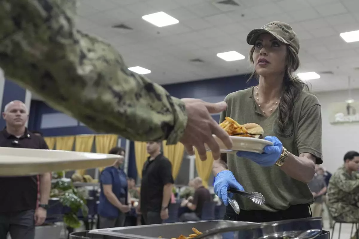 Homeland Security Secretary Kristi Noem helps serve sailors and coast guardsmen at Naval Support Activity in Bahrain, Saturday, May 24, 2025. (AP Photo/Alex Brandon, Pool)