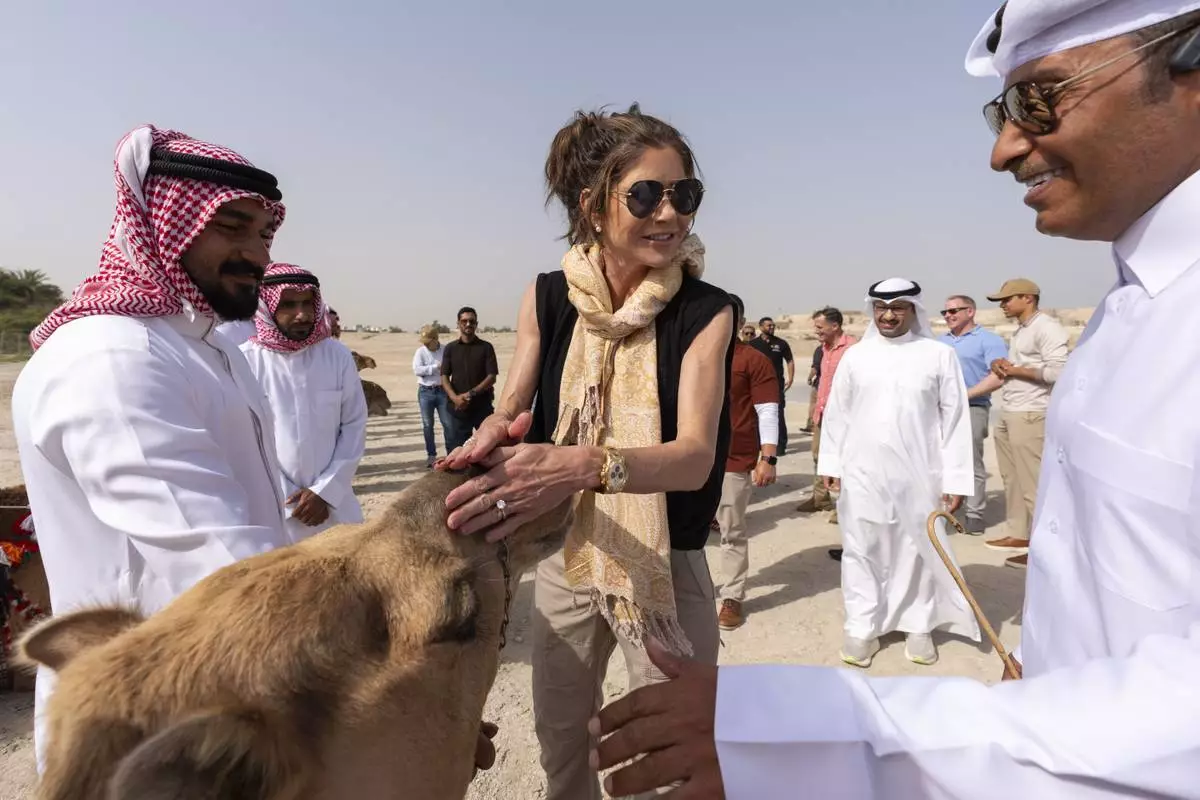 Homeland Security Secretary Kristi Noem pets a camel before a tour Qal'at al-Bahrain Fort, Sunday, May 25, 2025, near Manama, Bahrain. (AP Photo/Alex Brandon, Pool)
