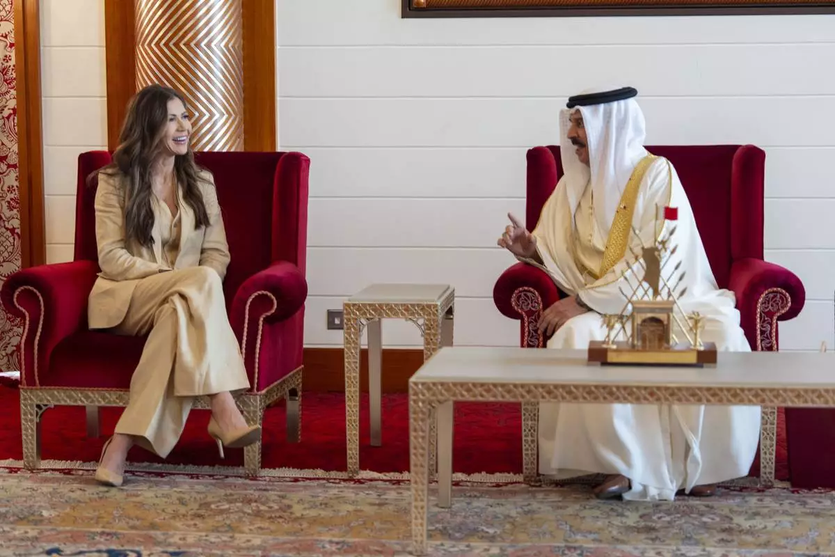 Homeland Security Secretary Kristi Noem meets with Bahrain's King Hamad bin Isa Al Khalifa at the Sakhir Royal Palace, Sunday, May 25, 2025, in Manama, Bahrain. (AP Photo/Alex Brandon, Pool)