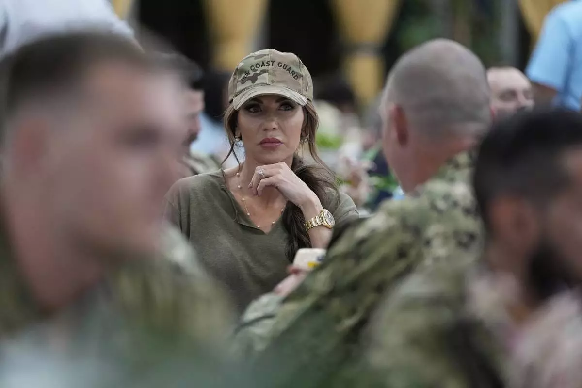 U.S. Homeland Security Secretary Kristi Noem speaks with sailors and Coast Guardsmen at Naval Support Activity in Bahrain, Saturday, May 24, 2025. (AP Photo/Alex Brandon, Pool)