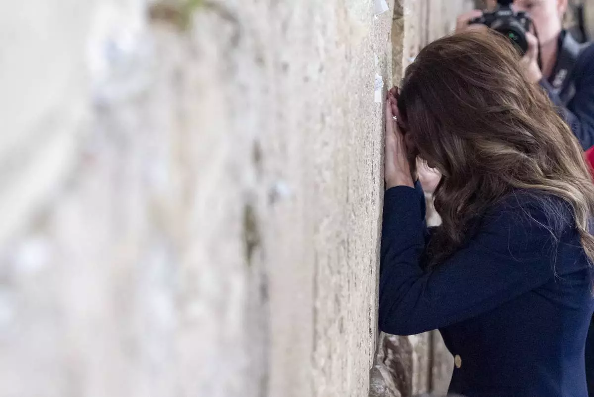 Homeland Security Secretary Kristi Noem bows her head after placing a note at the at the Western Wall, the holiest site where Jews can pray, in the Old City of Jerusalem, Sunday, May 25, 2025. (AP Photo/Alex Brandon, Pool)