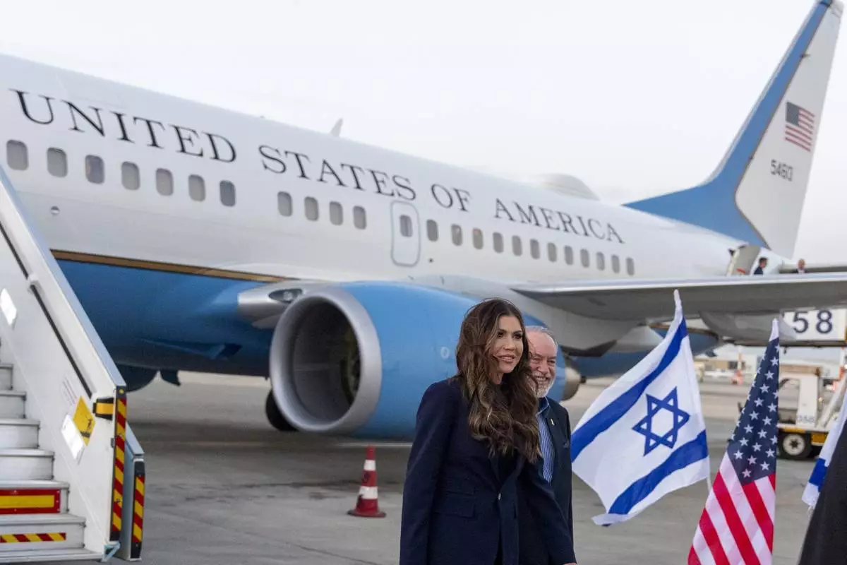 Homeland Security Secretary Kristi Noem walks with Ambassador Mike Huckabee arrives at Ben Gurion Airport, Sunday, May 25, 2025, Tel Aviv, Israel. (AP Photo/Alex Brandon, Pool)