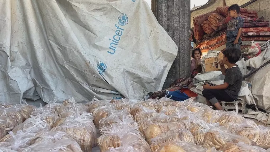 At a camp for Internally Displaced People in southern Gaza's Khan Younis, packs of fresh bread finally reached displaced families in urgent need on Saturday. Each pack has about 20 loaves and weighs some two kilograms. However, bread distribution every other day is dramatically insufficient to meet the basic needs of a population already living on the brink of survival.
