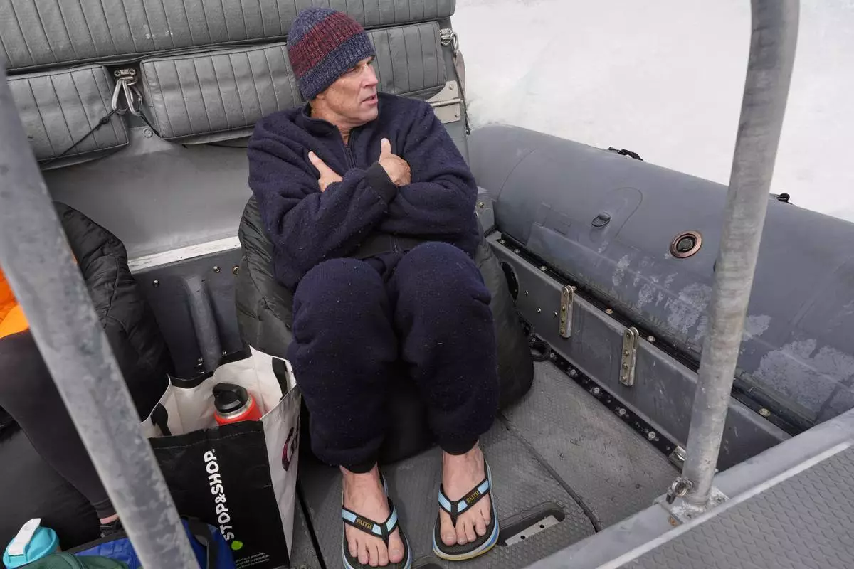 Endurance swimmer Lewis Pugh warms up on the ride back to shore after completing the first leg of his swim around Martha's Vineyard, Thursday, May 15, 2025, off Edgartown, Mass. (AP Photo/Robert F. Bukaty)