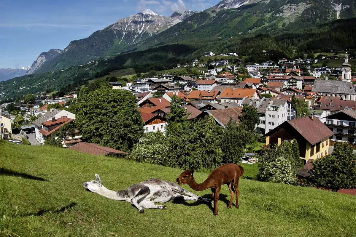 Alpacas chill on a meadow in the outskirts of Innsbruck, Austria, Friday, May 30, 2025. (AP Photo/Michael Probst)