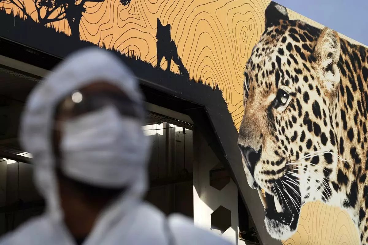 A health worker stands at the entrance to the zoo where vehicles are disinfected within a containment barrier for bird flu after the deaths of birds due to suspected bird flu in Brasilia, Brazil, Thursday, May 29, 2025. (AP Photo/Eraldo Peres)