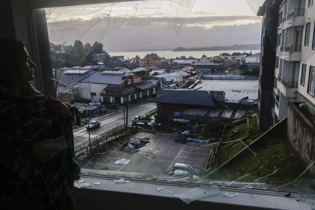 A woman looks through her home's broken window at more damage the day after tornado hit Puerto Varas, Chile, Monday, May 26, 2025. (AP Photo/Patricio Aguayo)