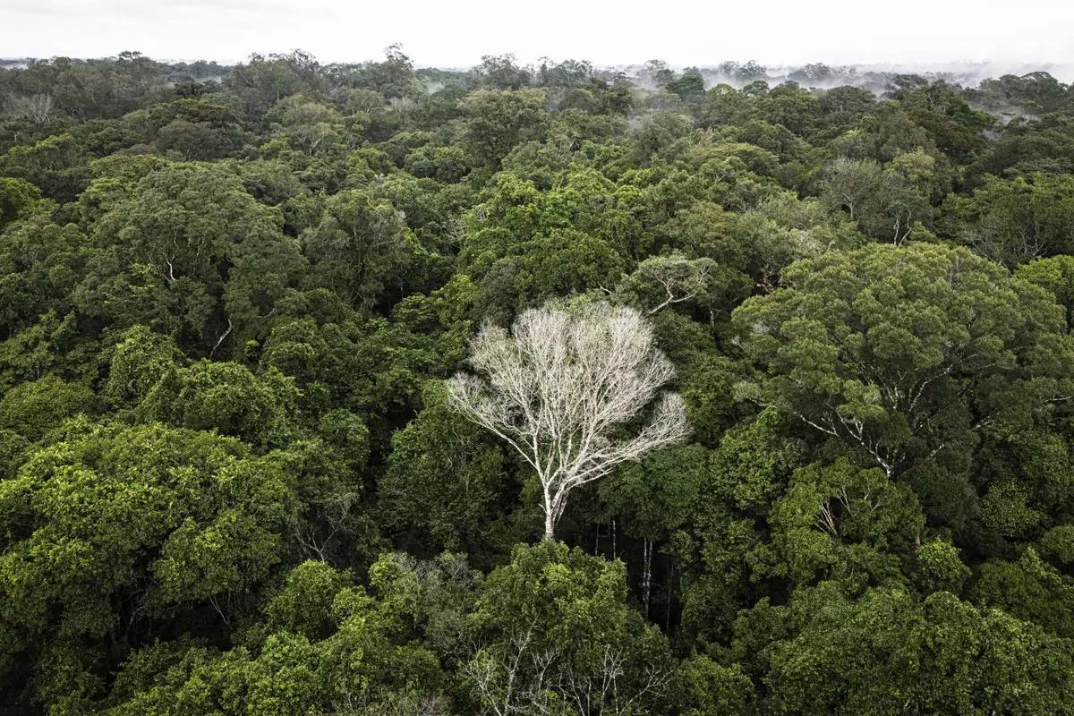 A white tree that is dead stands within a section of the Caxiuana National Forest that is used as a control plot for an experiment on drought run by the Esecaflor project in Para state, Brazil, Saturday, March 22, 2025. (AP Photo/Jorge Saenz)