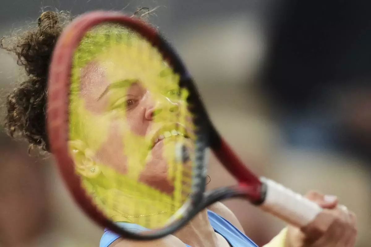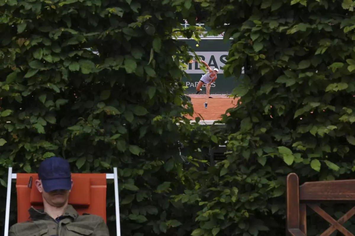 Serbia's Olga Danilovic is reflected in a glass as she serves against Aryna Sabalenka of Belarus during their third round match of the French Tennis Open, at the Roland-Garros stadium, in Paris, Friday, May 30, 2025. (AP Photo/Lindsey Wasson)