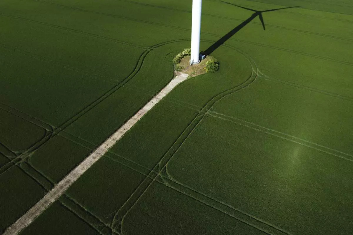 The shadow of a wind turbine falls on a field at a wind farm near Aschersleben, Germany, Monday, May 26, 2025. (AP Photo/Matthias Schrader)