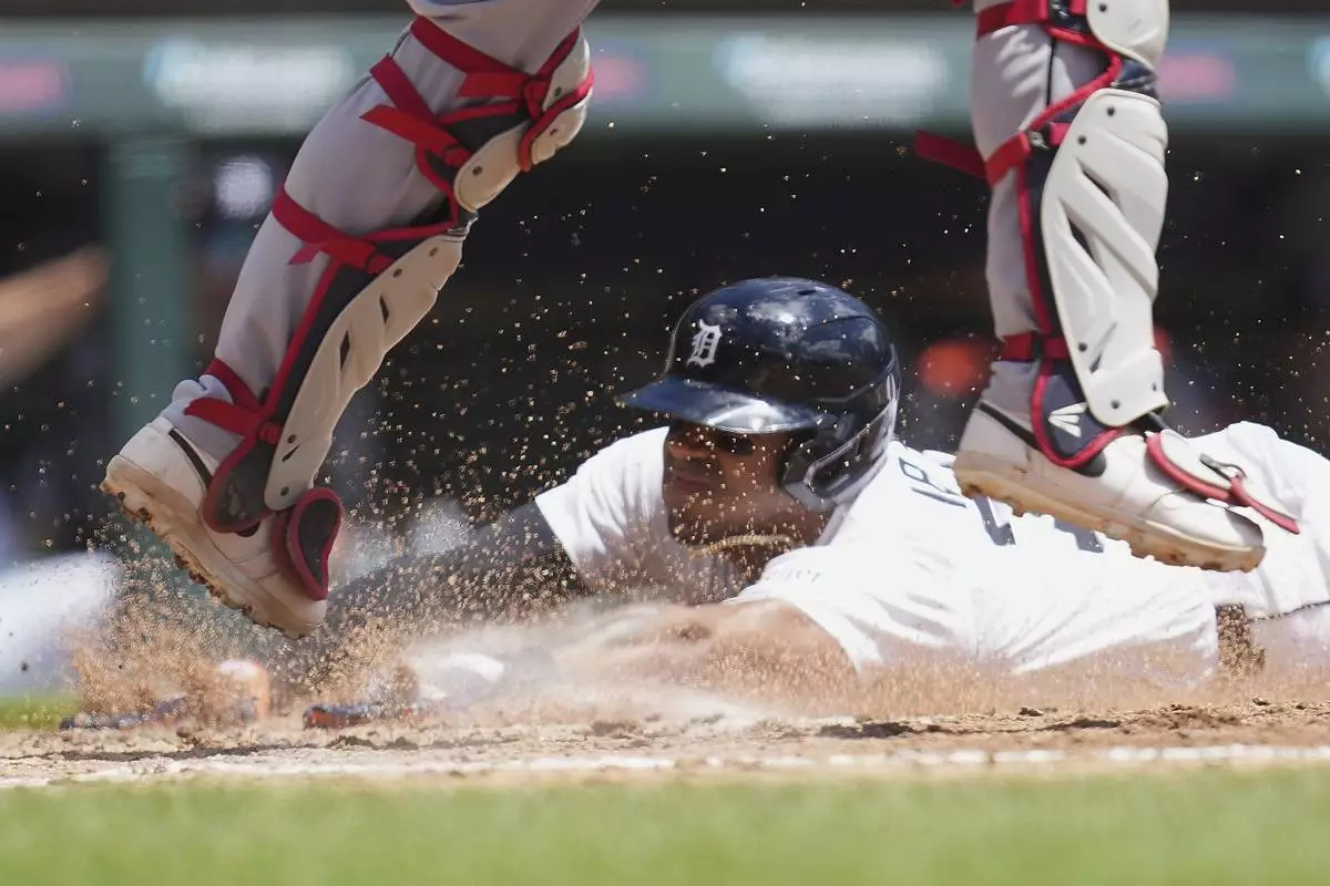 Detroit Tigers third base Andy Ib·Òez slides safely into home plate under Cleveland Guardians catcher Austin Hedges in the fourth inning during a baseball game, Sunday, May 25, 2025, in Detroit. (AP Photo/Paul Sancya)